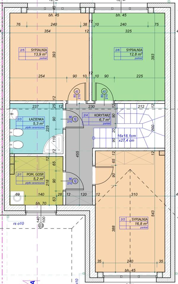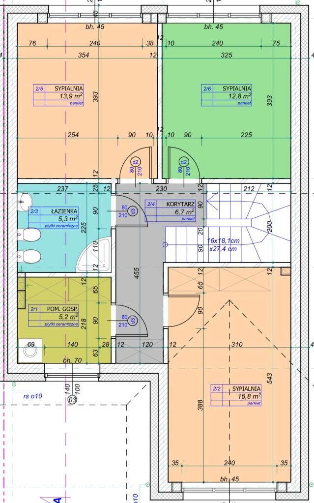 Na piętrze (bez skosów): pokoje dla dzieci oraz sypialnia rodziców z możliwością zaaranżowania garderoby.