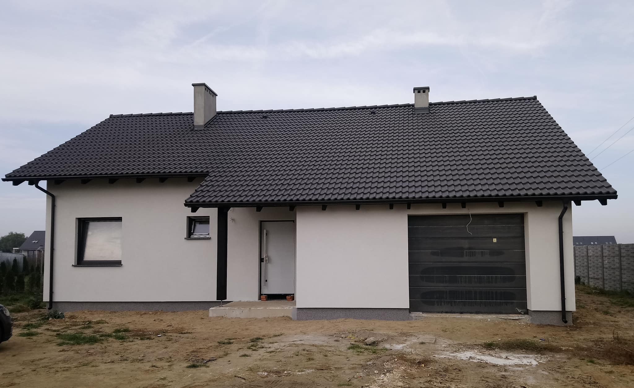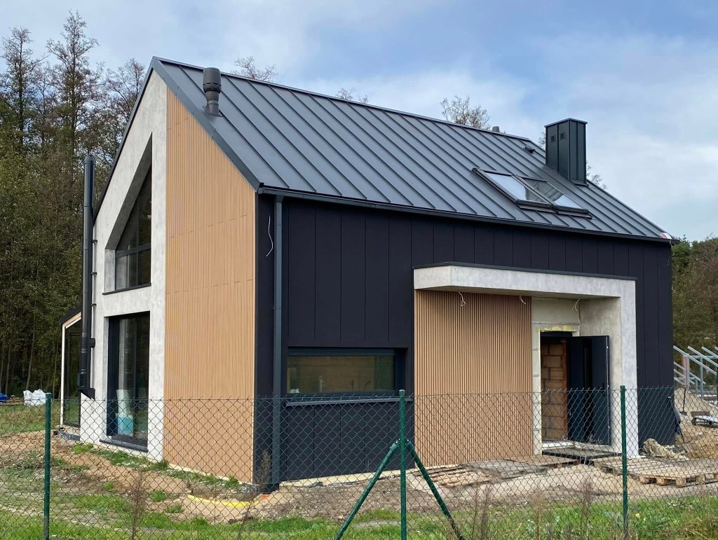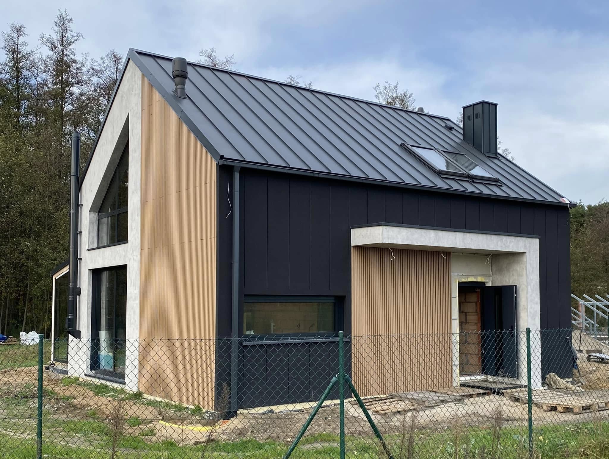 – Pokrycie dachu z dachówki Braas w kolorze grafitowym, wyłaz na dach